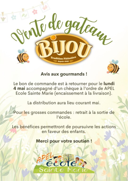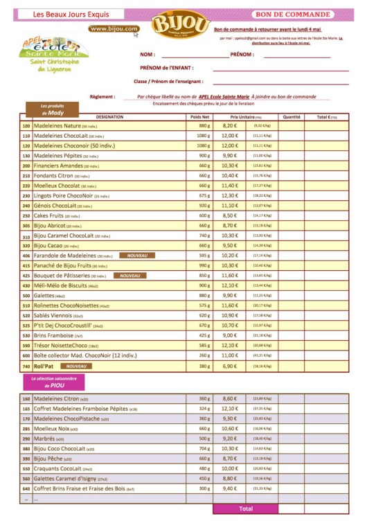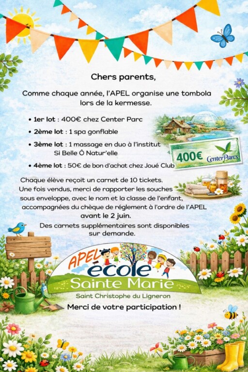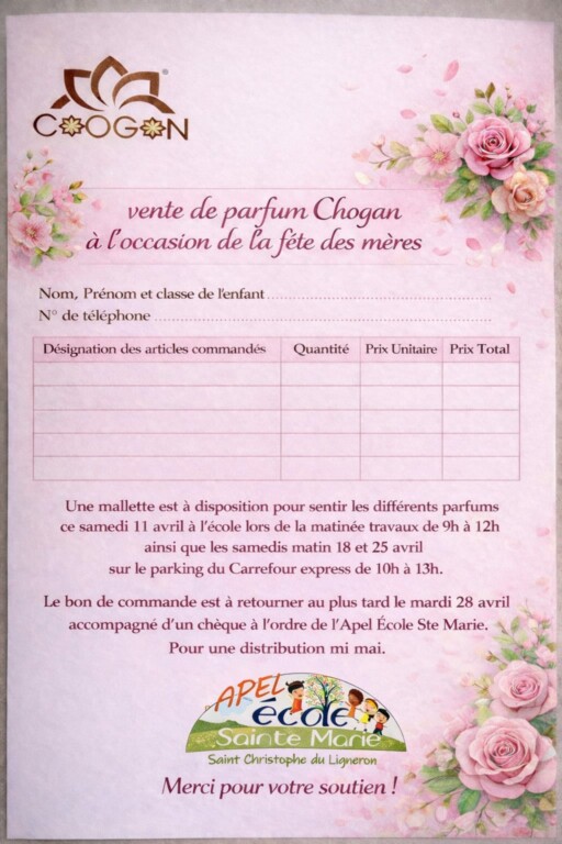 Opérations de l’APEL Commande parfum – Spéciale fête des mères et des pères Pour le mardi 28 avril Commande Bijou Pour le lundi 4 mai Tombola de la kermesse du 27 juin Retour pour le 2 juin